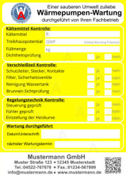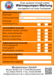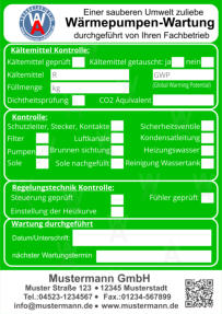 Bei der regelmäßige Wartung von Wärmepumpen, um deren Leistung, Effizienz, Sicherheit und Lebensdauer zu erhalten lassen sich die Aufkleber bestens einsetzen. Es wird empfohlen, alle 1 - 2 Jahre die Wartung der Wärmepumpe von einem qualifizierten Fachmann durchgeführen zu lassen, der über das nötige Fachwissen und die Erfahrung verfügt Auf diesem Aufkleber sind alle wichtige Merkmale für die Wartung vorgegeben und können schriftlich festgehalten werden. Auch auf den nächste Wartungstermin wird hingewiesen.