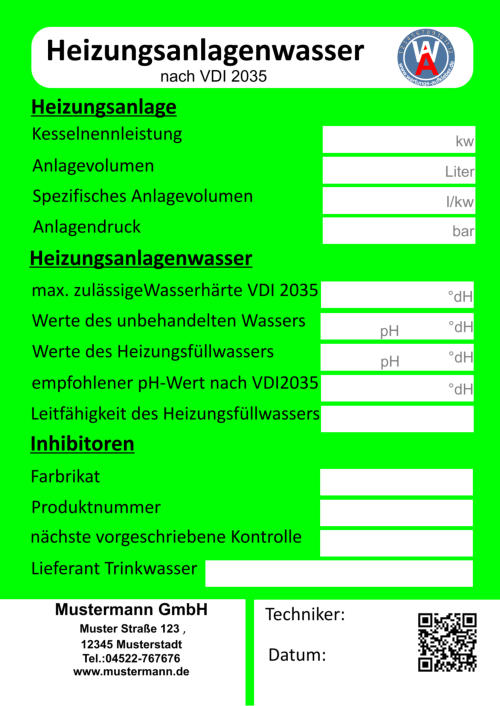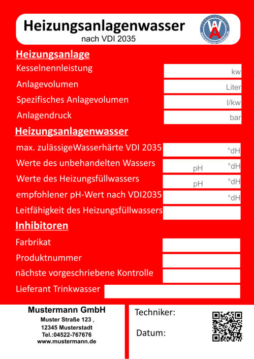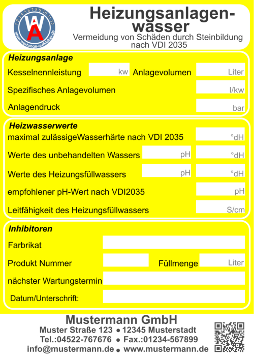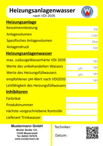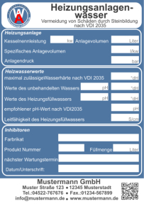 Bei der Wartung zur Vermeidung von Schäden in Warmwasser-Heizungsanlagen - Steinbildung in Trinkwassererwärmungs- und Warmwasser- Heizungsanlagenlassen lassen sich die Aufkleber bestens einsetzen. Im Jahre2005 wurde die Richtlinienreihe VDI 2035 "Vermeidung von Schäden in Warmwasser-Heizungsanlagen" eingeführt. Sie schreibt unter anderem die Qualität des Heizungsfüllwassers vor. Auf diesem Aufkleber sind alle wichtige Merkmale für die VDI 2035 vorgegeben und die systemrelevanten Daten können schriftlich festgehalten werden. Auch auf den nächste Wartungstermin wird hingewiesen.