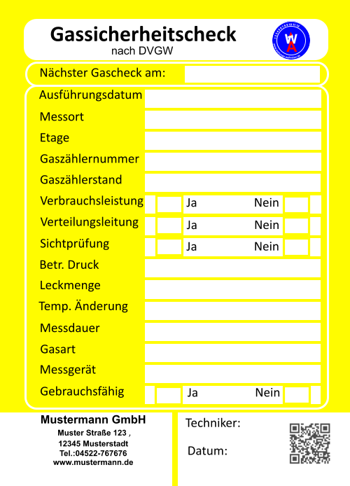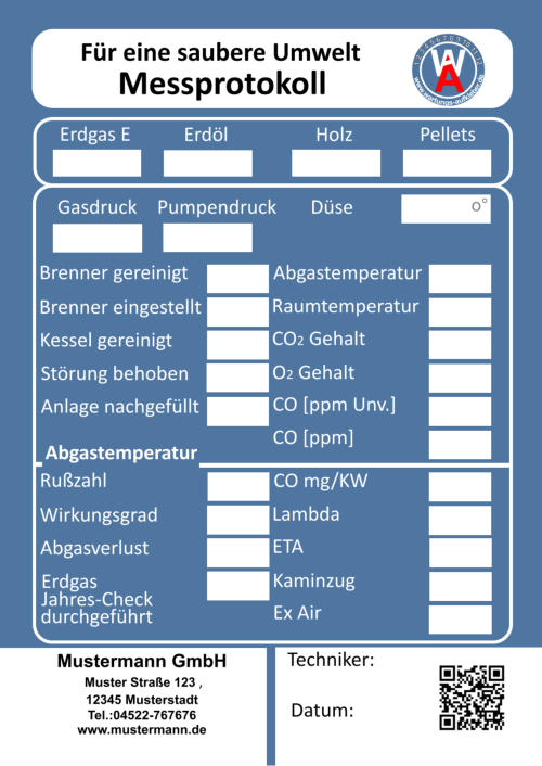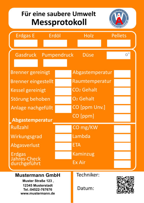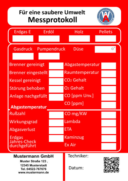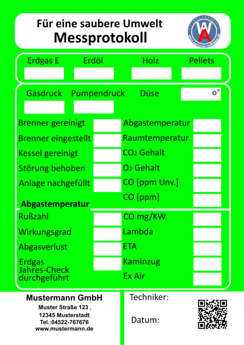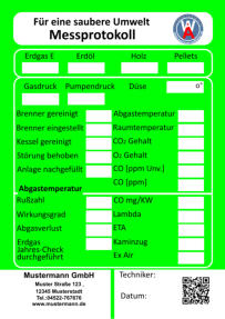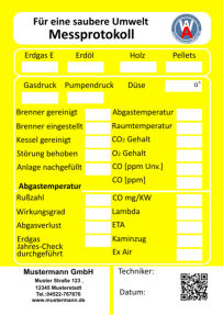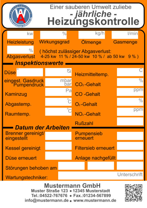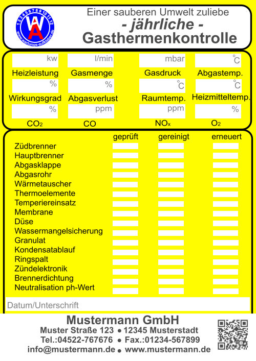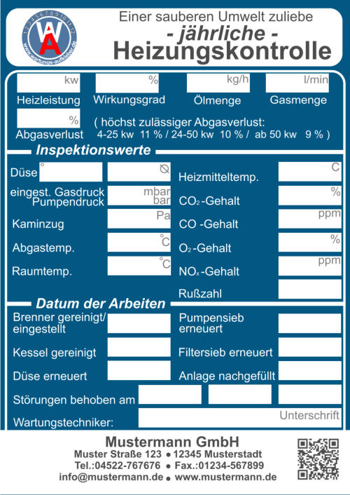 Muster Straße 123    12345 Musterstadt  Tel.:04522-767676     Fax.:01234-567899 info@mustermann.de    www.mustermann.de  Mustermann GmbH Einer sauberen Umwelt zuliebe  Heizungskontrolle  1 2 3 4 5 6 7 8 9 10 11 12     www.wartungs-aufkleber.de W A - jährliche - Heizleistung  kw   Wirkungsgrad %  Ölmenge  kg/h  Gasmenge  l/min  Heizmitteltemp.                  CO2 -Gehalt                        CO -Gehalt                        O2 -Gehalt                          NOx -Gehalt                        Rußzahl C % ppm % ppm Kaminzug                           Abgastemp. Raumtemp. ° ° C C Düse    eingest. Gasdruck  mbar Pumpendruck bar Pa ° Brenner gereinigt/ eingestellt   Düse erneuert Kessel gereinigt Störungen behoben am      Abgasverlust %    ( höchst zulässiger Abgasverlust:    4-25 kw  11 % / 24-50 kw  10 % /  ab 50 kw   9 % ) Pumpensieb erneuert   Anlage nachgefüllt Filtersieb erneuert Wartungstechniker: Inspektionswerte Datum der Arbeiten Unterschrift  Muster Straße 123    12345 Musterstadt  Tel.:04522-767676     Fax.:01234-567899 info@mustermann.de    www.mustermann.de  Mustermann GmbH  1 2 3 4 5 6 7 8 9 10 11 12     www.wartungs-aufkleber.de W A Einer sauberen Umwelt zuliebe  Gasthermenkontrolle - jährliche - Heizleistung  kw   Wirkungsgrad l/min  CO2  CO  O2  NOx   Abgasverlust  Heizmitteltemp.  Raumtemp.  Gasdruck mbar ° C ° C %  Gasmenge Abgastemp. ppm  %  %  ppm  %  ° C Datum/Unterschrift geprüft         gereinigt          erneuert  I Züdbrenner                                                                   Hauptbrenner                                                           Abgasklappe                           Abgasrohr                           Wärmetauscher                   Thermoelemente                 Temperiereinsatz               Membrane                          Düse                                     Wassermangelsicherung      Granulat                                Kondensatablauf                   Ringspalt                              Zündelektronik                     Brennerdichtung                  Neutralisation ph-Wert                                    Kesselnennleistung                      Anlagevolumen Spezifisches Anlagevolumen Anlagendruck maximal zulässigeWasserhärte nach VDI 2035 l/kw  kw bar Werte des unbehandelten Wassers Werte des Heizungsfüllwassers empfohlener pH-Wert nach VDI2035 Leitfähigkeit des Heizungsfüllwassers Farbrikat Produkt Nummer nächster Wartungstermin °dH °dH °dH pH S/cm pH pH Datum/Unterschrift: Liter  Muster Straße 123    12345 Musterstadt  Tel.:04522-767676     Fax.:01234-567899 info@mustermann.de    www.mustermann.de  Mustermann GmbH Inhibitoren Heizwasserwerte Heizungsanlage Heizungsanlagen-          wasser  1 2 3 4 5 6 7 8 9 10 11 12     www.wartungs-aufkleber.de W A Vermeidung von Schäden durch Steinbildung  nach VDI 2035 Füllmenge Liter Kesselnennleistung                      Anlagevolumen Spezifisches Anlagevolumen Anlagendruck maximal zulässigeWasserhärte nach VDI 2035 l/kw  kw bar Werte des unbehandelten Wassers Werte des Heizungsfüllwassers empfohlener pH-Wert nach VDI2035 Leitfähigkeit des Heizungsfüllwassers Farbrikat Produkt Nummer nächster Wartungstermin °dH °dH °dH pH S/cm pH pH Datum/Unterschrift: Liter  Muster Straße 123    12345 Musterstadt  Tel.:04522-767676     Fax.:01234-567899 info@mustermann.de    www.mustermann.de  Mustermann GmbH Inhibitoren Heizwasserwerte Heizungsanlage Heizungsanlagen-          wasser  1 2 3 4 5 6 7 8 9 10 11 12     www.wartungs-aufkleber.de W A Vermeidung von Schäden durch Steinbildung  nach VDI 2035 Füllmenge Liter