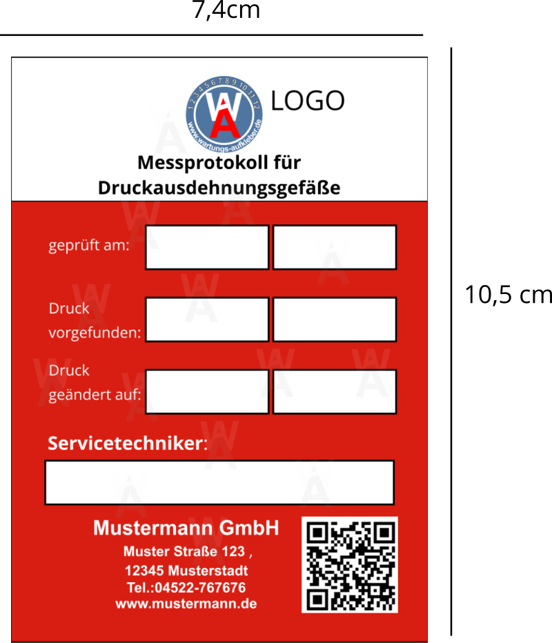 Messprotokoll für Druckausdehnungsgefäße geprüft am: Druck vorgefunden: Druck geändert auf: Servicetechniker:  1 2 3 4 5 6 7 8 9 10 11 12     www.wartungs-aufkleber.de W A LOGO Mustermann GmbH    Muster Straße 123 ,  12345 Musterstadt   Tel.:04522-767676 www.mustermann.de Messprotokoll für Druckausdehnungsgefäße geprüft am: Druck vorgefunden: Druck geändert auf: Servicetechniker:  1 2 3 4 5 6 7 8 9 10 11 12     www.wartungs-aufkleber.de W A LOGO Mustermann GmbH    Muster Straße 123 ,  12345 Musterstadt   Tel.:04522-767676 www.mustermann.de Messprotokoll für Druckausdehnungsgefäße geprüft am: Druck vorgefunden: Druck geändert auf: Servicetechniker:  1 2 3 4 5 6 7 8 9 10 11 12     www.wartungs-aufkleber.de W A LOGO Mustermann GmbH    Muster Straße 123 ,  12345 Musterstadt   Tel.:04522-767676 www.mustermann.de Messprotokoll für Druckausdehnungsgefäße geprüft am: Druck vorgefunden: Druck geändert auf: Servicetechniker:  1 2 3 4 5 6 7 8 9 10 11 12     www.wartungs-aufkleber.de W A LOGO Mustermann GmbH    Muster Straße 123 ,  12345 Musterstadt   Tel.:04522-767676 www.mustermann.de •	Grafikservice - farbiger Aufdruck der Firmenadresse und/oder        des Firmenlogos auf diesemWartungsprotokoll •	Text- / Logo-Upload während des Bestellvorgangs •	Erstellung des QR Codes für den Zugang zu Ihrer        Firmenhomepage per Smartphone •	Korrekturabzug und Druckfreigabe senden wir per E-Mail zu •	Versandkostenfrei in Deutschland •	Bezahlung per Rechnung (B2B - nur gewerbliche Kunden)  All Inclusive-Preis: keine versteckten Kosten.