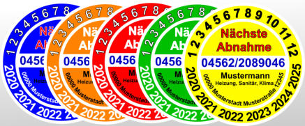 Eine professionelle Betreuung und Wartung von Heizungsanlagen, Sanitäranlagen und Solaranlagen muss natürlich auch lückenlos dokumentiert werden. Gut sichtbare Prüfplaketten dokumentieren in komprimierter Form den Zeitpunkt des nächsten Servicetermins und die Kontaktdaten Ihres Fachbetriebes.