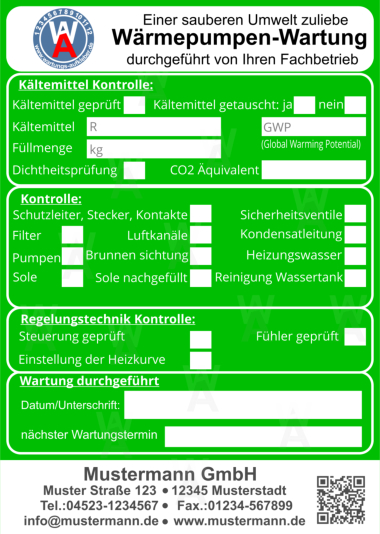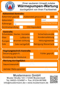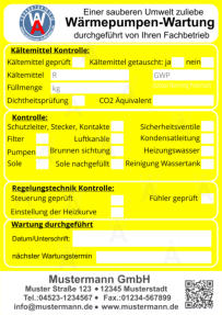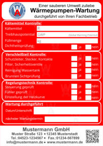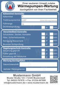Bei der regelmäßige Wartung von Wärmepumpen, um deren Leistung, Effizienz, Sicherheit und Lebensdauer zu erhalten lassen sich die Aufkleber bestens einsetzen. Es wird empfohlen, alle 1 - 2 Jahre die Wartung der Wärmepumpe von einem qualifizierten Fachmann durchgeführen zu lassen, der über das nötige Fachwissen und die Erfahrung verfügt Auf diesem Aufkleber sind alle wichtige Merkmale für die Wartung vorgegeben und können schriftlich festgehalten werden. Auch auf den nächste Wartungstermin wird hingewiesen.