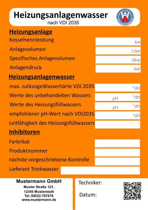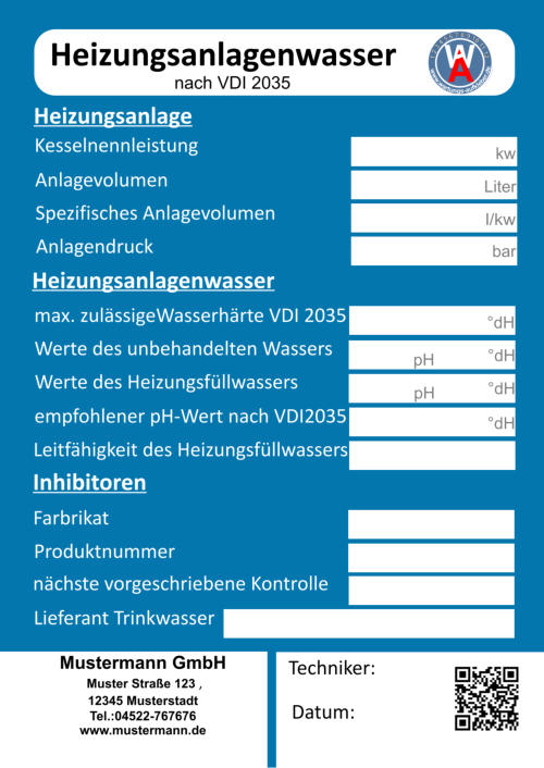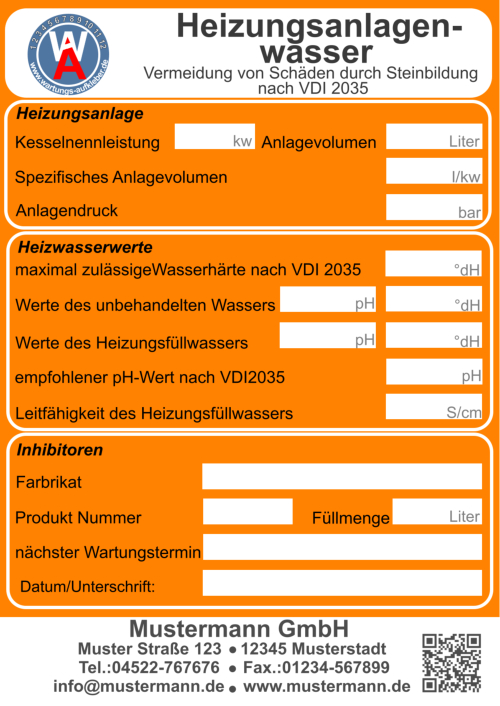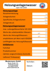 Bei der Wartung zur Vermeidung von Schäden in Warmwasser-Heizungsanlagen - Steinbildung in Trinkwassererwärmungs- und Warmwasser- Heizungsanlagenlassen lassen sich die Aufkleber bestens einsetzen. Im Jahre2005 wurde die Richtlinienreihe VDI 2035 "Vermeidung von Schäden in Warmwasser-Heizungsanlagen" eingeführt. Sie schreibt unter anderem die Qualität des Heizungsfüllwassers vor. Auf diesem Aufkleber sind alle wichtige Merkmale für die VDI 2035 vorgegeben und die systemrelevanten Daten können schriftlich festgehalten werden. Auch auf den nächste Wartungstermin wird hingewiesen.