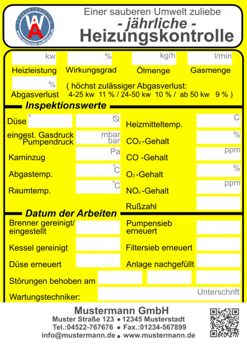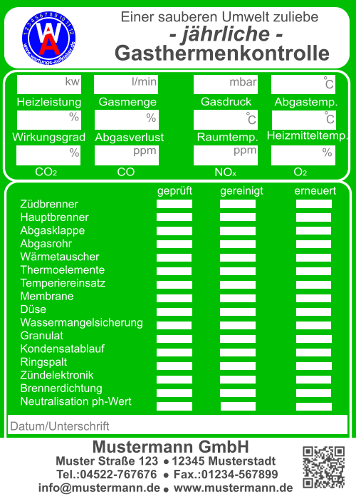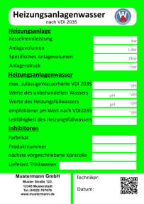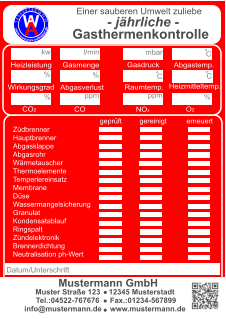 Muster Straße 123    12345 Musterstadt  Tel.:04522-767676     Fax.:01234-567899 info@mustermann.de    www.mustermann.de  Mustermann GmbH Einer sauberen Umwelt zuliebe  Heizungskontrolle  1 2 3 4 5 6 7 8 9 10 11 12     www.wartungs-aufkleber.de W A - jährliche - Heizleistung  kw   Wirkungsgrad %  Ölmenge  kg/h  Gasmenge  l/min  Heizmitteltemp.                  CO2 -Gehalt                        CO -Gehalt                        O2 -Gehalt                          NOx -Gehalt                        Rußzahl C % ppm % ppm Kaminzug                           Abgastemp. Raumtemp. ° ° C C Düse    eingest. Gasdruck  mbar Pumpendruck bar Pa ° Brenner gereinigt/ eingestellt   Düse erneuert Kessel gereinigt Störungen behoben am      Abgasverlust %    ( höchst zulässiger Abgasverlust:    4-25 kw  11 % / 24-50 kw  10 % /  ab 50 kw   9 % ) Pumpensieb erneuert   Anlage nachgefüllt Filtersieb erneuert Wartungstechniker: Inspektionswerte Datum der Arbeiten Unterschrift  Muster Straße 123    12345 Musterstadt  Tel.:04522-767676     Fax.:01234-567899 info@mustermann.de    www.mustermann.de  Mustermann GmbH  1 2 3 4 5 6 7 8 9 10 11 12     www.wartungs-aufkleber.de W A Einer sauberen Umwelt zuliebe  Gasthermenkontrolle - jährliche - Heizleistung  kw   Wirkungsgrad l/min  CO2  CO  O2  NOx   Abgasverlust  Heizmitteltemp.  Raumtemp.  Gasdruck mbar ° C ° C %  Gasmenge Abgastemp. ppm  %  %  ppm  %  ° C Datum/Unterschrift geprüft         gereinigt          erneuert  I Züdbrenner                                                                   Hauptbrenner                                                           Abgasklappe                           Abgasrohr                           Wärmetauscher                   Thermoelemente                 Temperiereinsatz               Membrane                          Düse                                     Wassermangelsicherung      Granulat                                Kondensatablauf                   Ringspalt                              Zündelektronik                     Brennerdichtung                  Neutralisation ph-Wert                                    Kesselnennleistung                      Anlagevolumen Spezifisches Anlagevolumen Anlagendruck maximal zulässigeWasserhärte nach VDI 2035 l/kw  kw bar Werte des unbehandelten Wassers Werte des Heizungsfüllwassers empfohlener pH-Wert nach VDI2035 Leitfähigkeit des Heizungsfüllwassers Farbrikat Produkt Nummer nächster Wartungstermin °dH °dH °dH pH S/cm pH pH Datum/Unterschrift: Liter  Muster Straße 123    12345 Musterstadt  Tel.:04522-767676     Fax.:01234-567899 info@mustermann.de    www.mustermann.de  Mustermann GmbH Inhibitoren Heizwasserwerte Heizungsanlage Heizungsanlagen-          wasser  1 2 3 4 5 6 7 8 9 10 11 12     www.wartungs-aufkleber.de W A Vermeidung von Schäden durch Steinbildung  nach VDI 2035 Füllmenge Liter Kesselnennleistung                      Anlagevolumen Spezifisches Anlagevolumen Anlagendruck maximal zulässigeWasserhärte nach VDI 2035 l/kw  kw bar Werte des unbehandelten Wassers Werte des Heizungsfüllwassers empfohlener pH-Wert nach VDI2035 Leitfähigkeit des Heizungsfüllwassers Farbrikat Produkt Nummer nächster Wartungstermin °dH °dH °dH pH S/cm pH pH Datum/Unterschrift: Liter  Muster Straße 123    12345 Musterstadt  Tel.:04522-767676     Fax.:01234-567899 info@mustermann.de    www.mustermann.de  Mustermann GmbH Inhibitoren Heizwasserwerte Heizungsanlage Heizungsanlagen-          wasser  1 2 3 4 5 6 7 8 9 10 11 12     www.wartungs-aufkleber.de W A Vermeidung von Schäden durch Steinbildung  nach VDI 2035 Füllmenge Liter