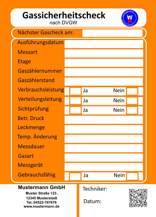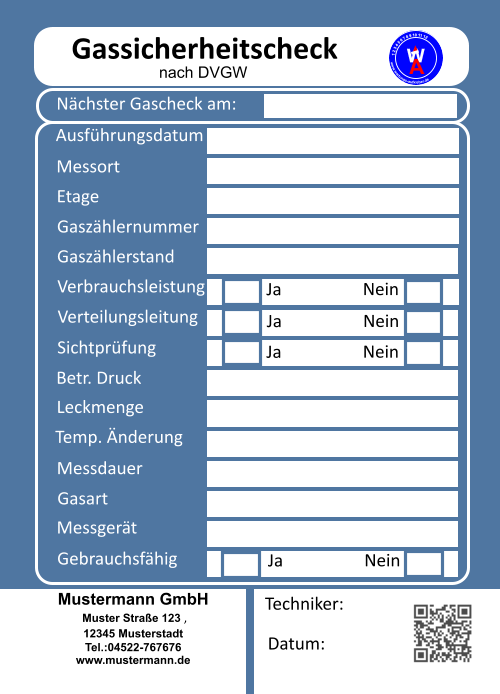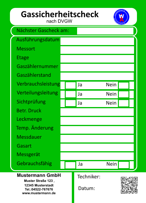 Messprotokoll für Druckausdehnungsgefäße geprüft am: Druck vorgefunden: Druck geändert auf: Servicetechniker:  1 2 3 4 5 6 7 8 9 10 11 12     www.wartungs-aufkleber.de W A LOGO Mustermann GmbH    Muster Straße 123 ,  12345 Musterstadt   Tel.:04522-767676 www.mustermann.de Messprotokoll für Druckausdehnungsgefäße geprüft am: Druck vorgefunden: Druck geändert auf: Servicetechniker:  1 2 3 4 5 6 7 8 9 10 11 12     www.wartungs-aufkleber.de W A LOGO Mustermann GmbH    Muster Straße 123 ,  12345 Musterstadt   Tel.:04522-767676 www.mustermann.de Messprotokoll für Druckausdehnungsgefäße geprüft am: Druck vorgefunden: Druck geändert auf: Servicetechniker:  1 2 3 4 5 6 7 8 9 10 11 12     www.wartungs-aufkleber.de W A LOGO Mustermann GmbH    Muster Straße 123 ,  12345 Musterstadt   Tel.:04522-767676 www.mustermann.de Messprotokoll für Druckausdehnungsgefäße geprüft am: Druck vorgefunden: Druck geändert auf: Servicetechniker:  1 2 3 4 5 6 7 8 9 10 11 12     www.wartungs-aufkleber.de W A LOGO Mustermann GmbH    Muster Straße 123 ,  12345 Musterstadt   Tel.:04522-767676 www.mustermann.de •	Grafikservice - farbiger Aufdruck der Firmenadresse und/oder        des Firmenlogos auf diesemWartungsprotokoll •	Text- / Logo-Upload während des Bestellvorgangs •	Erstellung des QR Codes für den Zugang zu Ihrer        Firmenhomepage per Smartphone •	Korrekturabzug und Druckfreigabe senden wir per E-Mail zu •	Versandkostenfrei in Deutschland •	Bezahlung per Rechnung (B2B - nur gewerbliche Kunden)  All Inclusive-Preis: keine versteckten Kosten.
